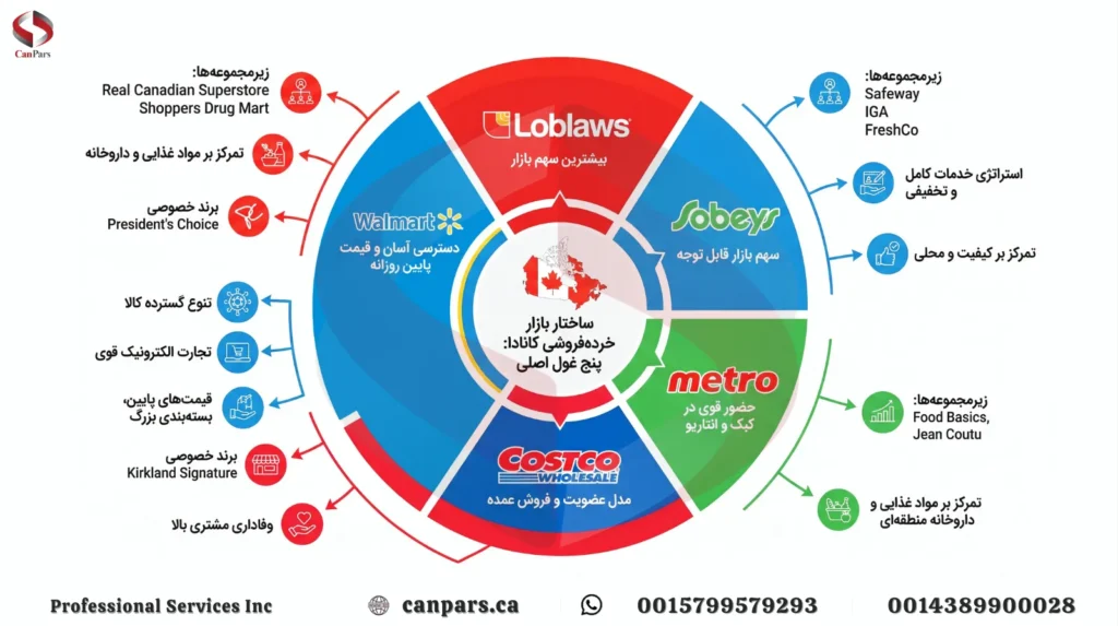 بازار خرده فروشی مواد غذایی کانادا بسیار متمرکز است و چند برند بزرگ سهم عمدهای از آن را در اختیار دارند. طبق گزارش USDA، پنج فروشگاه اصلی یعنی Loblaws ، Sobeys ، Metro ،Costco و Walmart بیش از ۶۰٪ سهم بازار خرده فروشی را تشکیل میدهند.